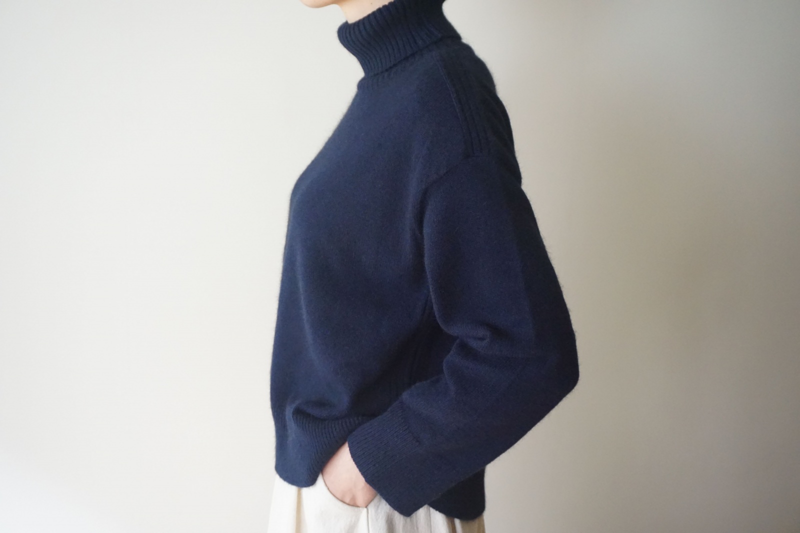オフタートルが首元を優しく包みます。すとんと落ちるきれいなシルエットは、シンプルでさりげなく