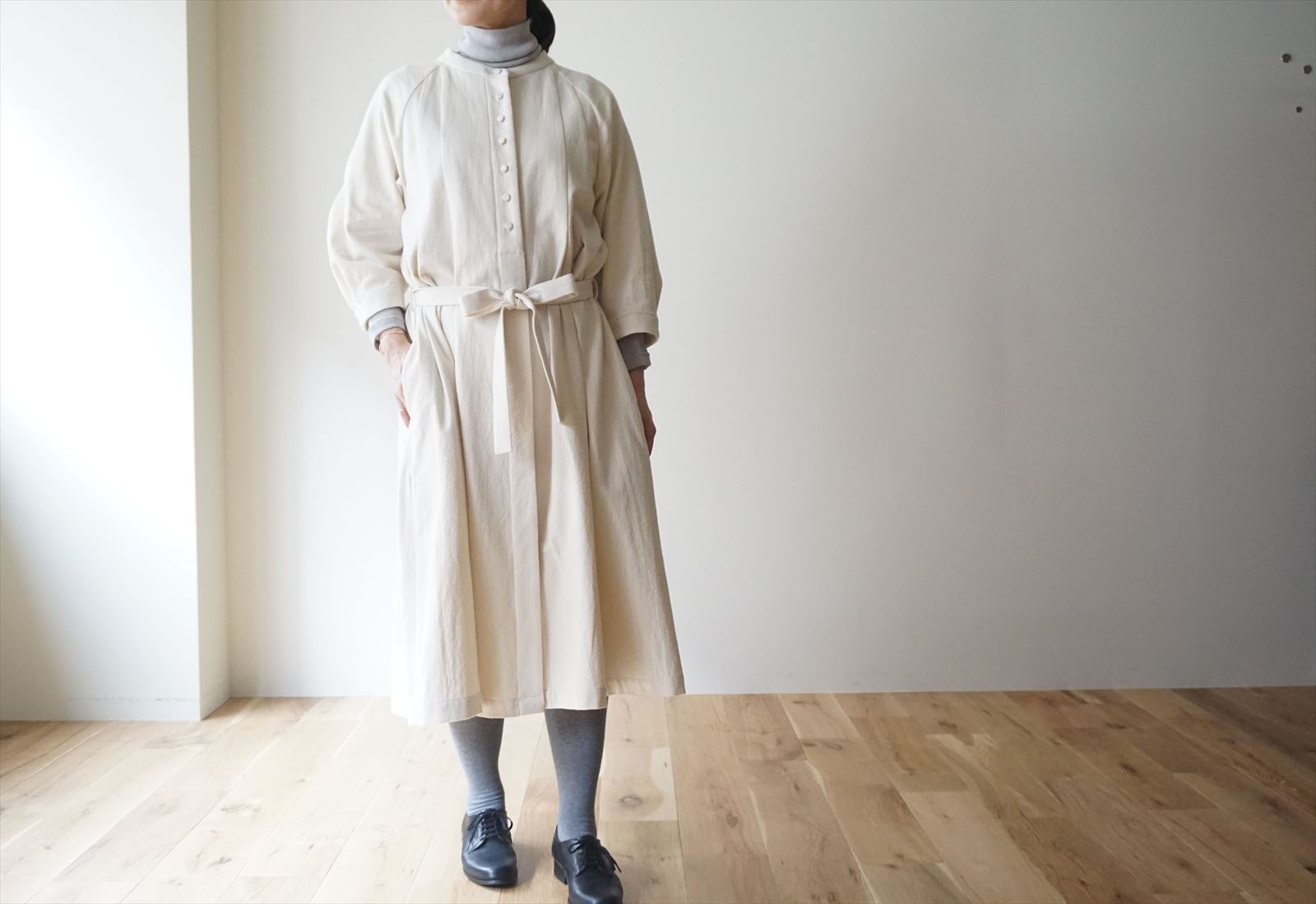丈が長いワンピースやウエストにボリュームがある物はあえて紐を外して着ればスッキリ。