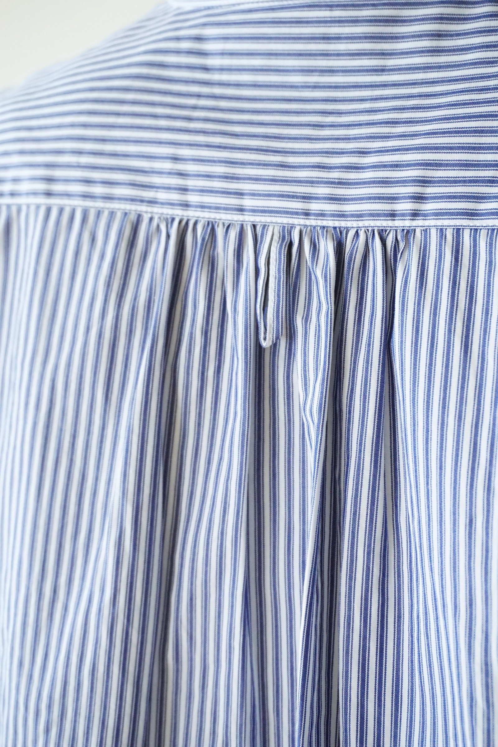 比翼開きのブラウスは、スタンドカラーの襟ぐりに寄せられたギャザーから広がる