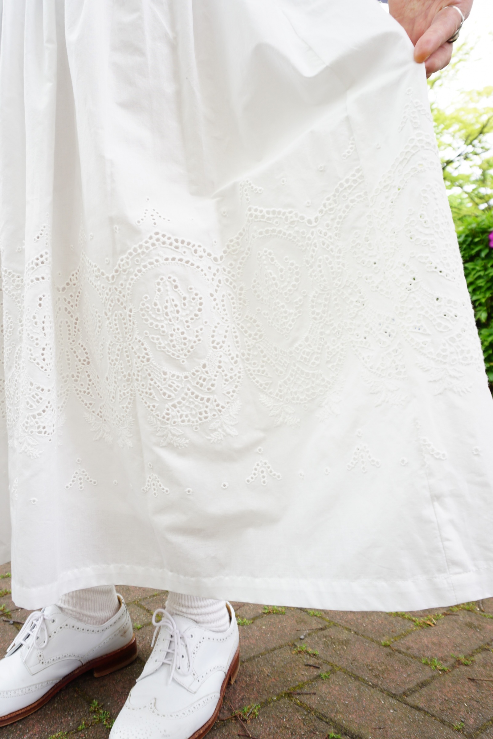 裾に刺繍の施されたスカート。シンプルなシャツでコーディネイトすると甘さが抑えられて