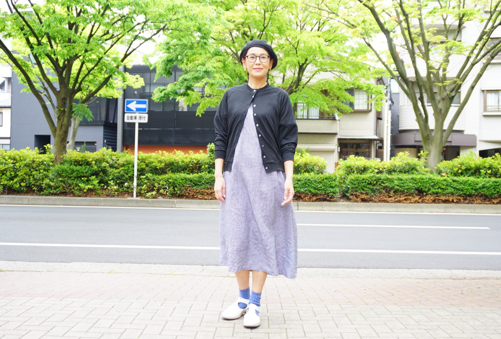 そして、少し衿が立ったリネンカーディガンを羽織って。