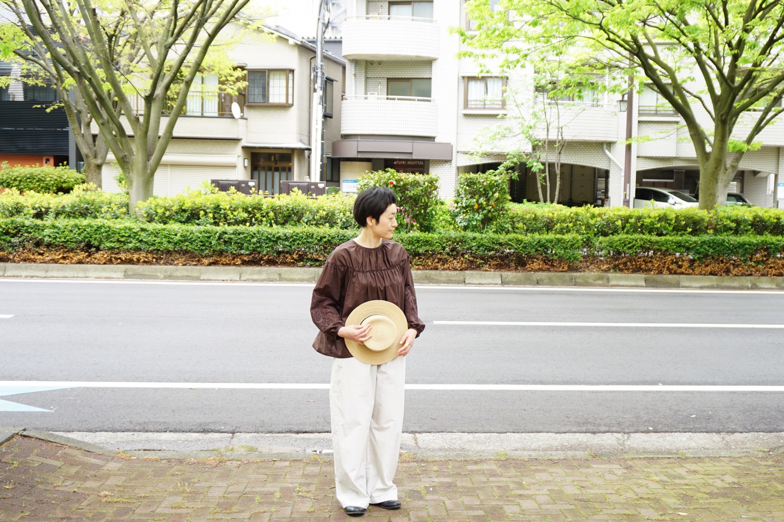 そしてブラウンカラーというのが新鮮で、ボトムのアイボリーとの相性も良いです。