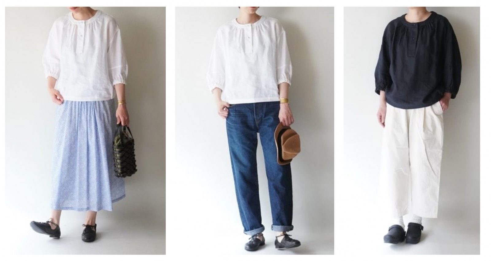 合わせたプレミアムリネンブラウスは先日ご紹介したワンピースと同じ素材を使用しています。