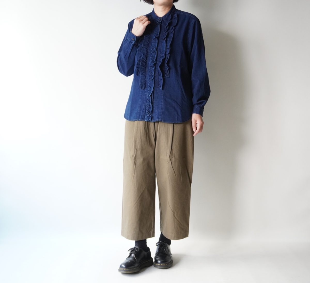 前身頃に仕立てられた贅沢なフリルが印象的なインディゴミレーブラウス。