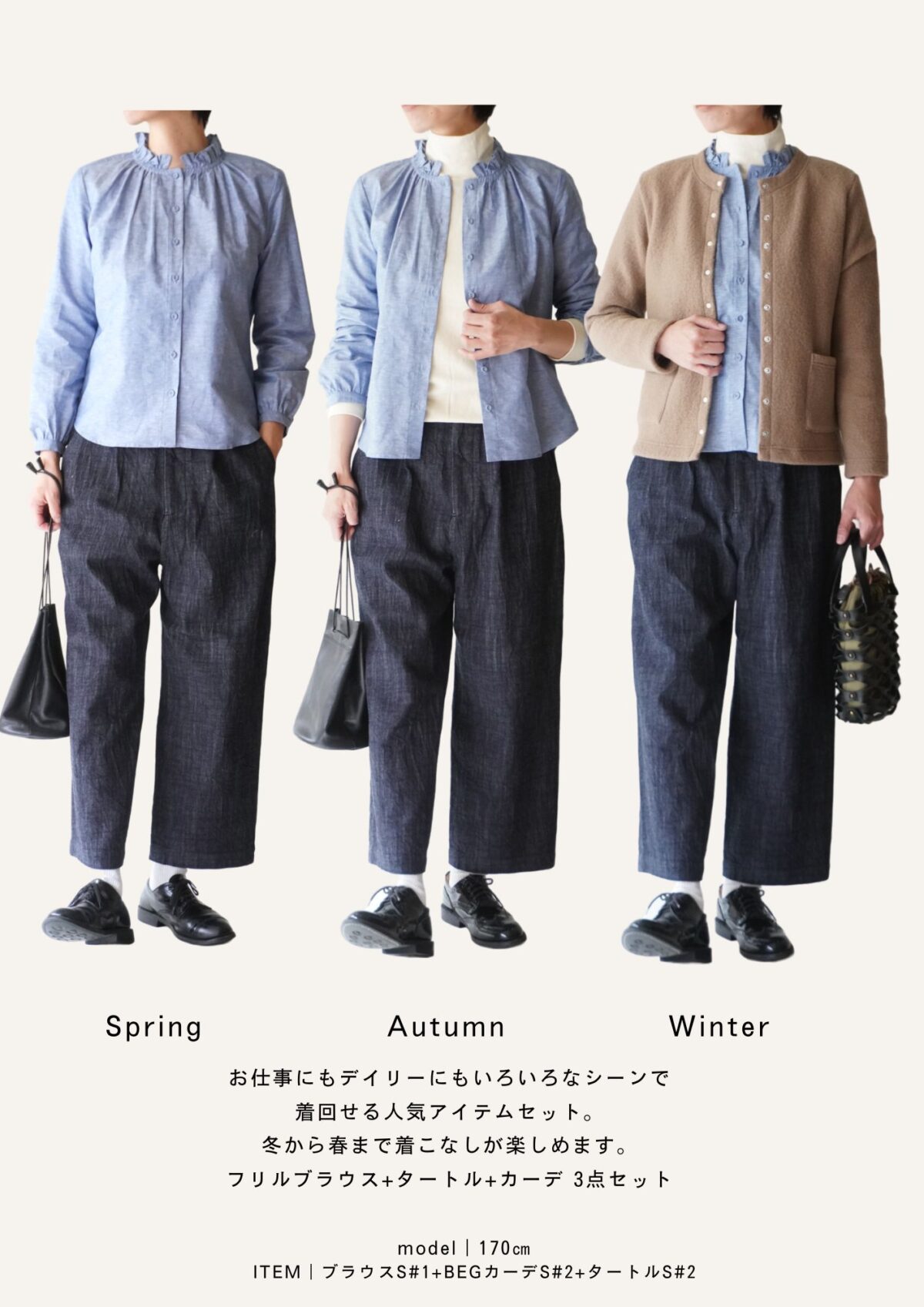 カーデは軽く暖かいので一枚あるとジャケット感覚で使え、ブラウスやタートルは
