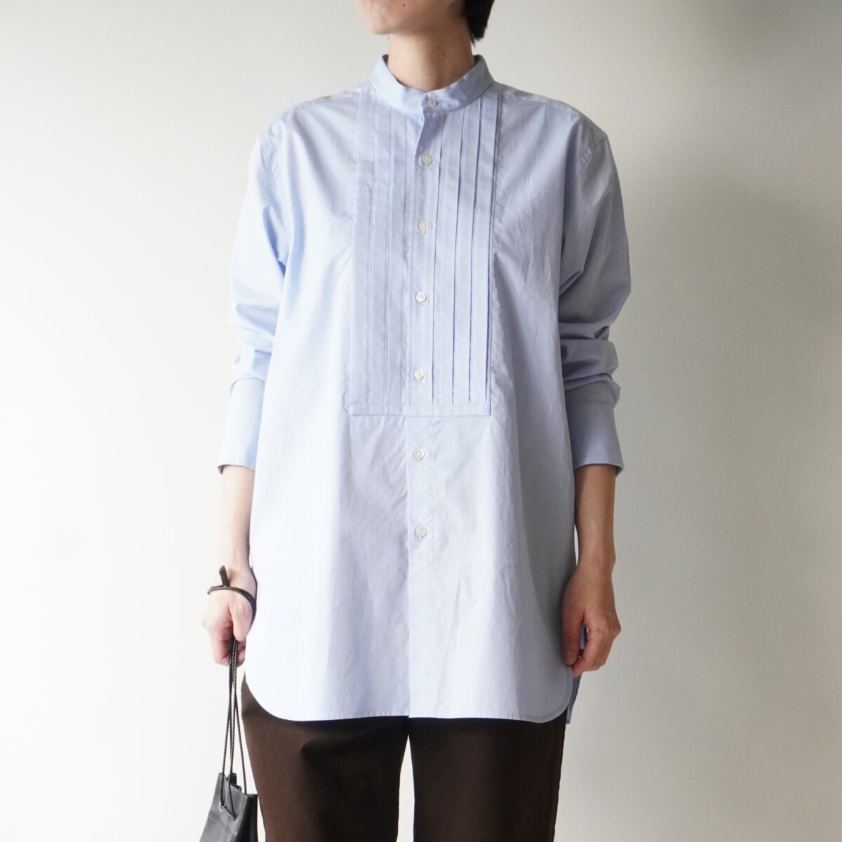 胸元のヨークや袖口にはピンタックを施し、細部まで女性らしさも感じるデザインに。