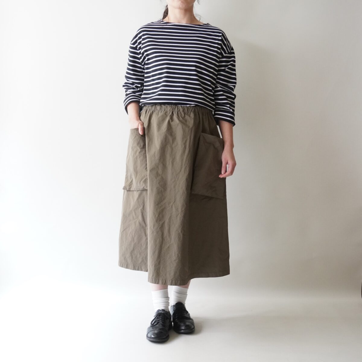 程よいラフさが合わせやすく、お店のスタッフにも人気のスカートです。