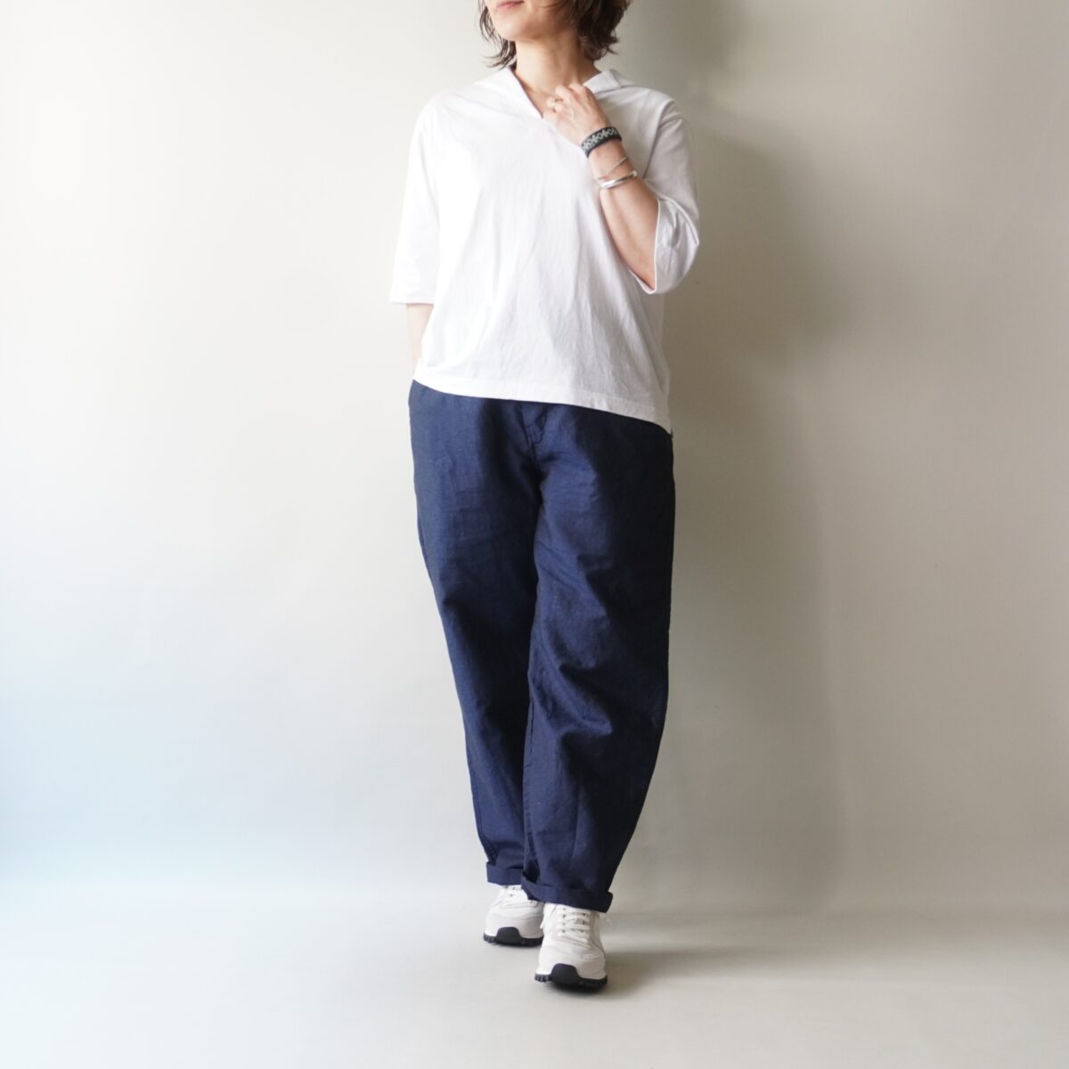 透明感のある白は重くなりがちな濃い目の色のボトムを中和させ涼やかな印象になります。