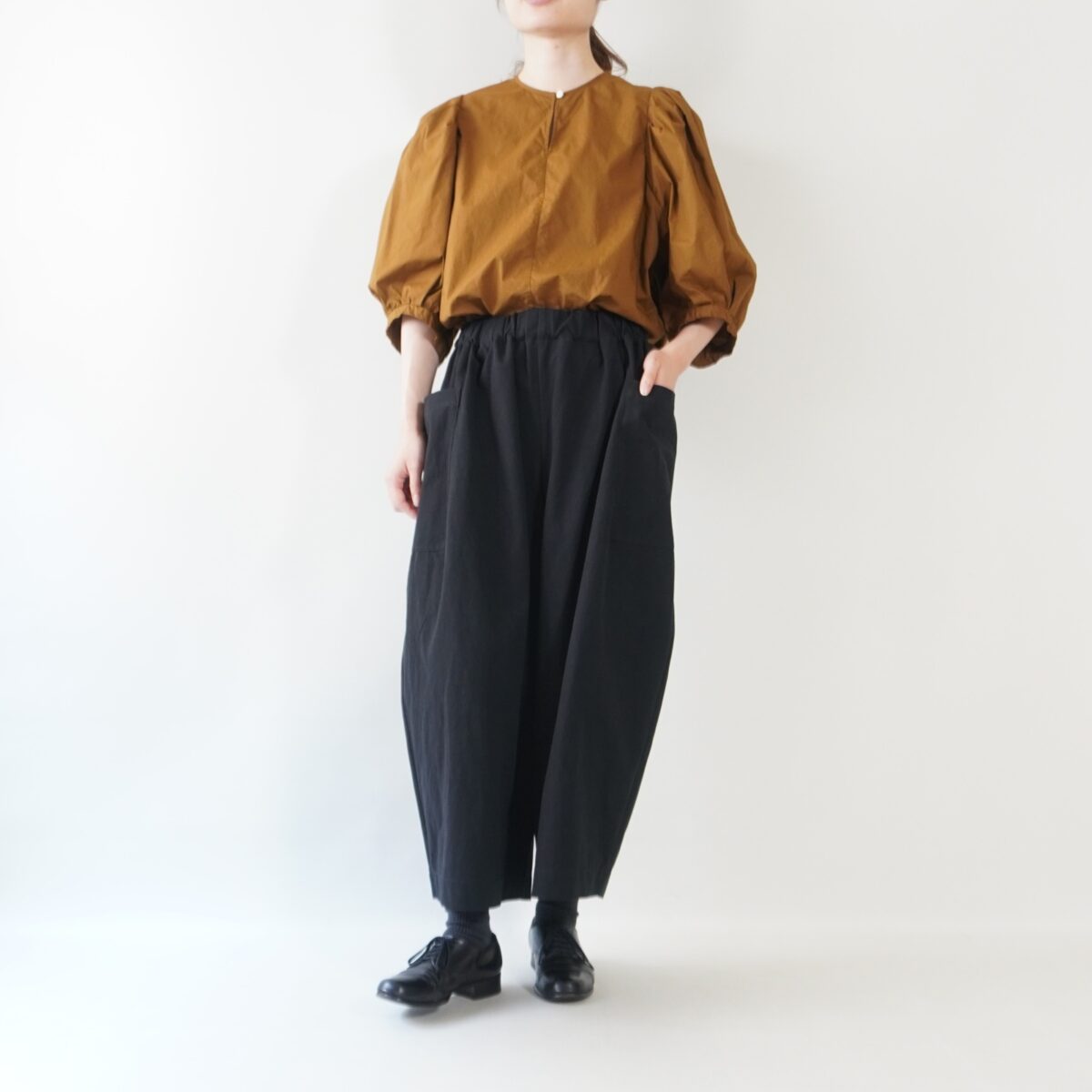 ウエストゴムのギャザーと大きなポケットで膨らみのある丸いシルエットが生まれ