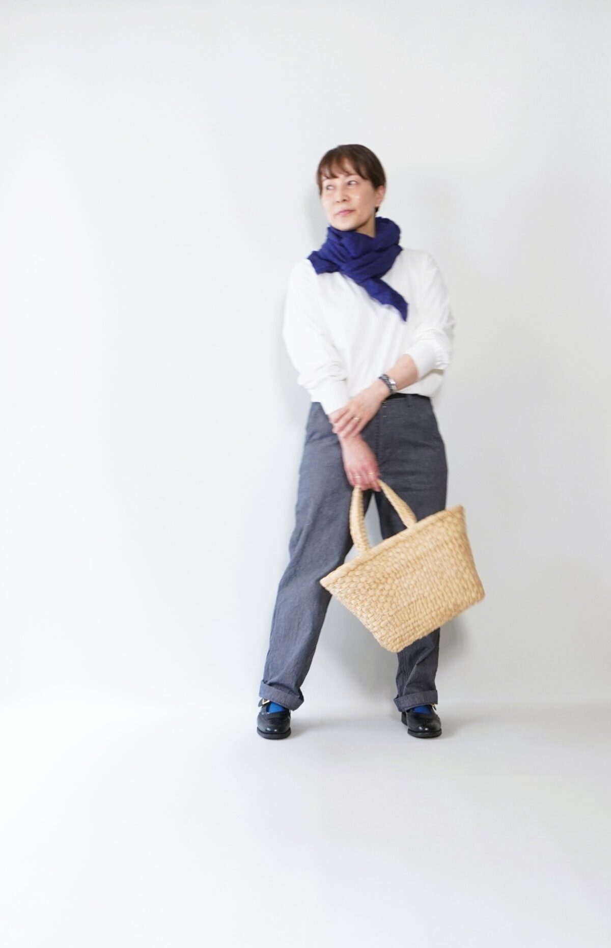 またサンダルから見える靴下の色もブルーに。