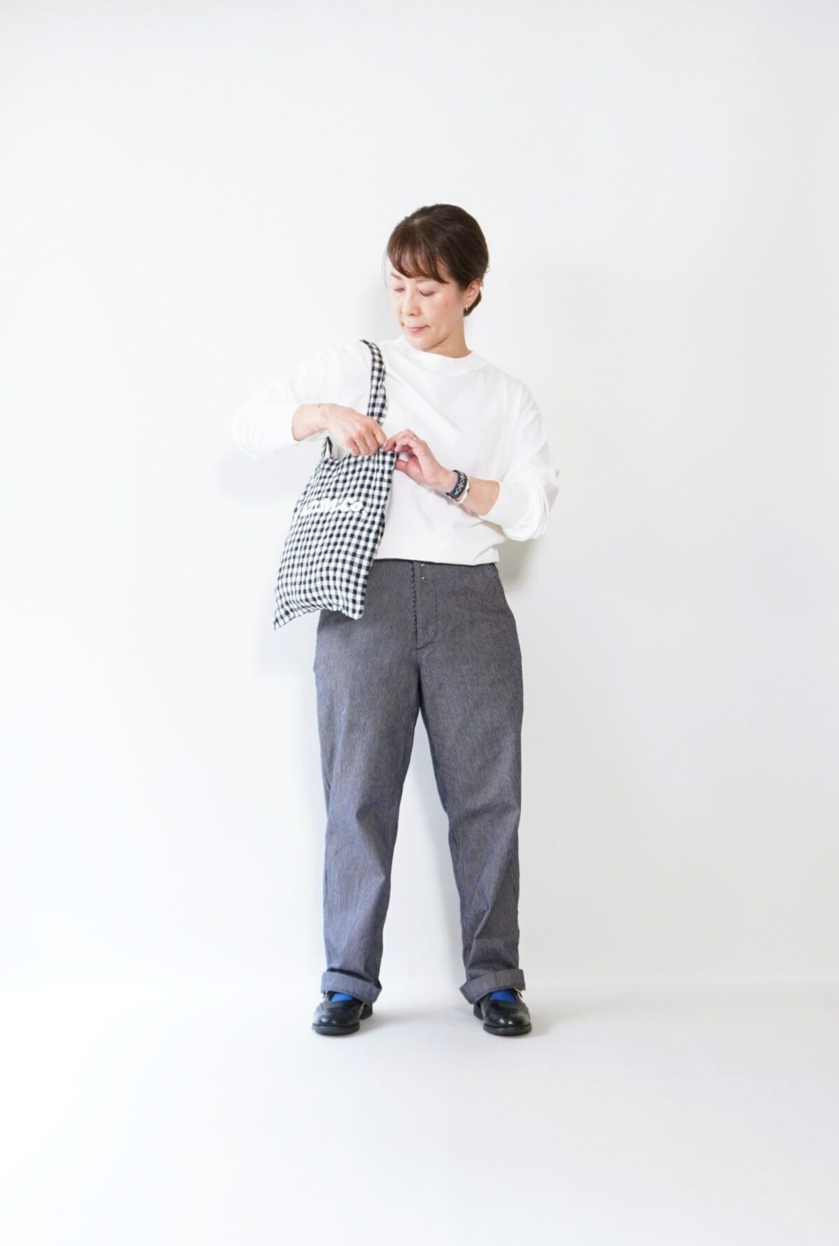 リネンの優しい風合いにギンガムチェック柄がコーディネートのアクセントになり