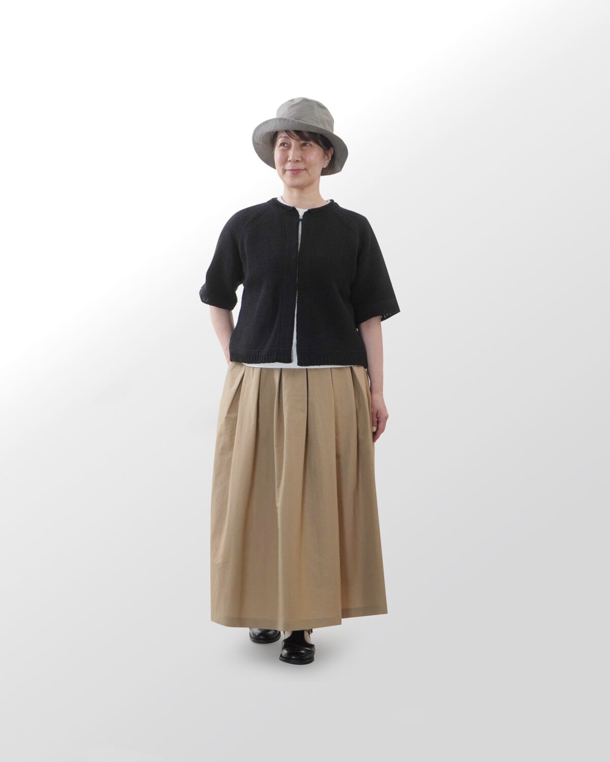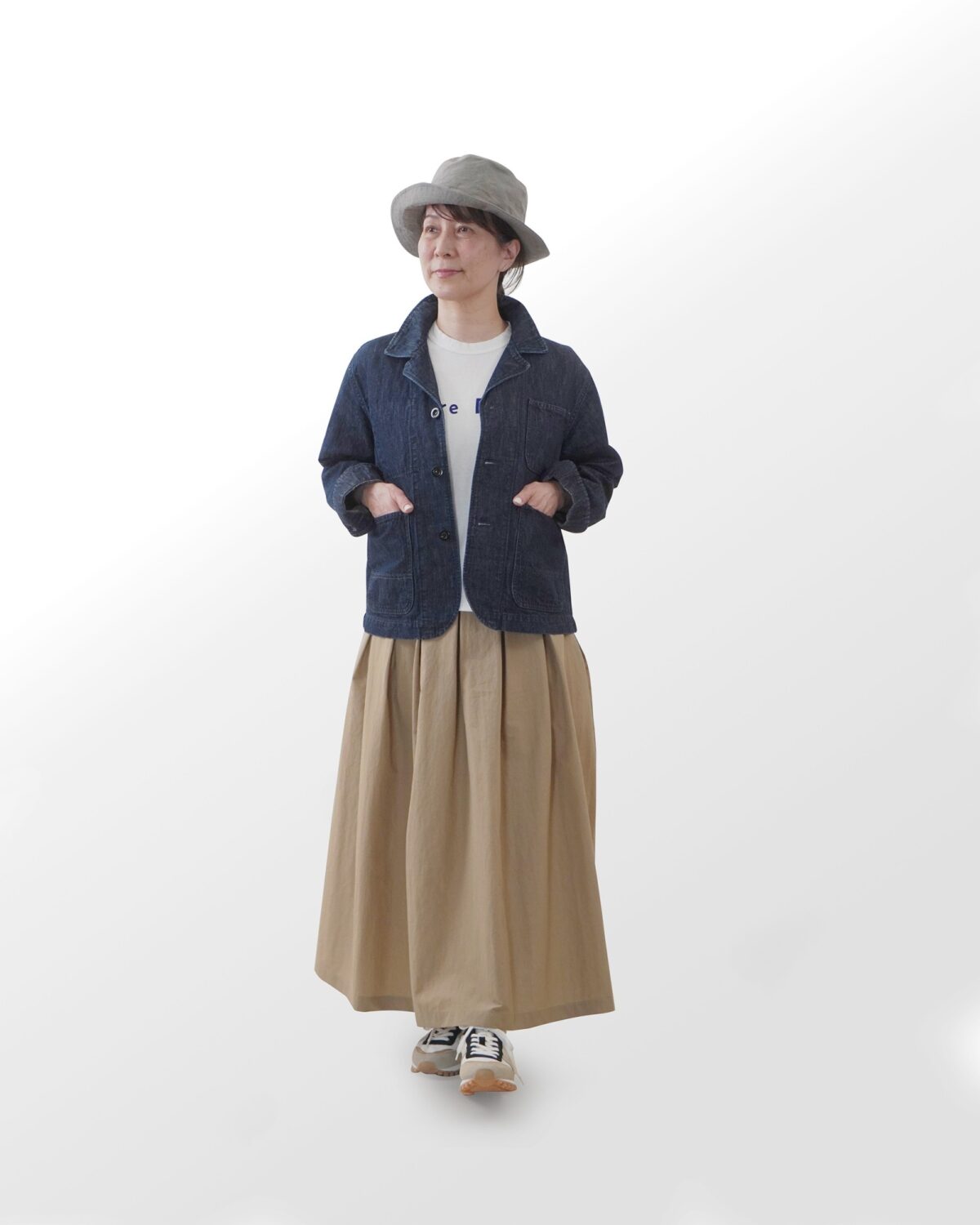 着丈はやや短くゆったりとしており、パンツからスカートとバランスも