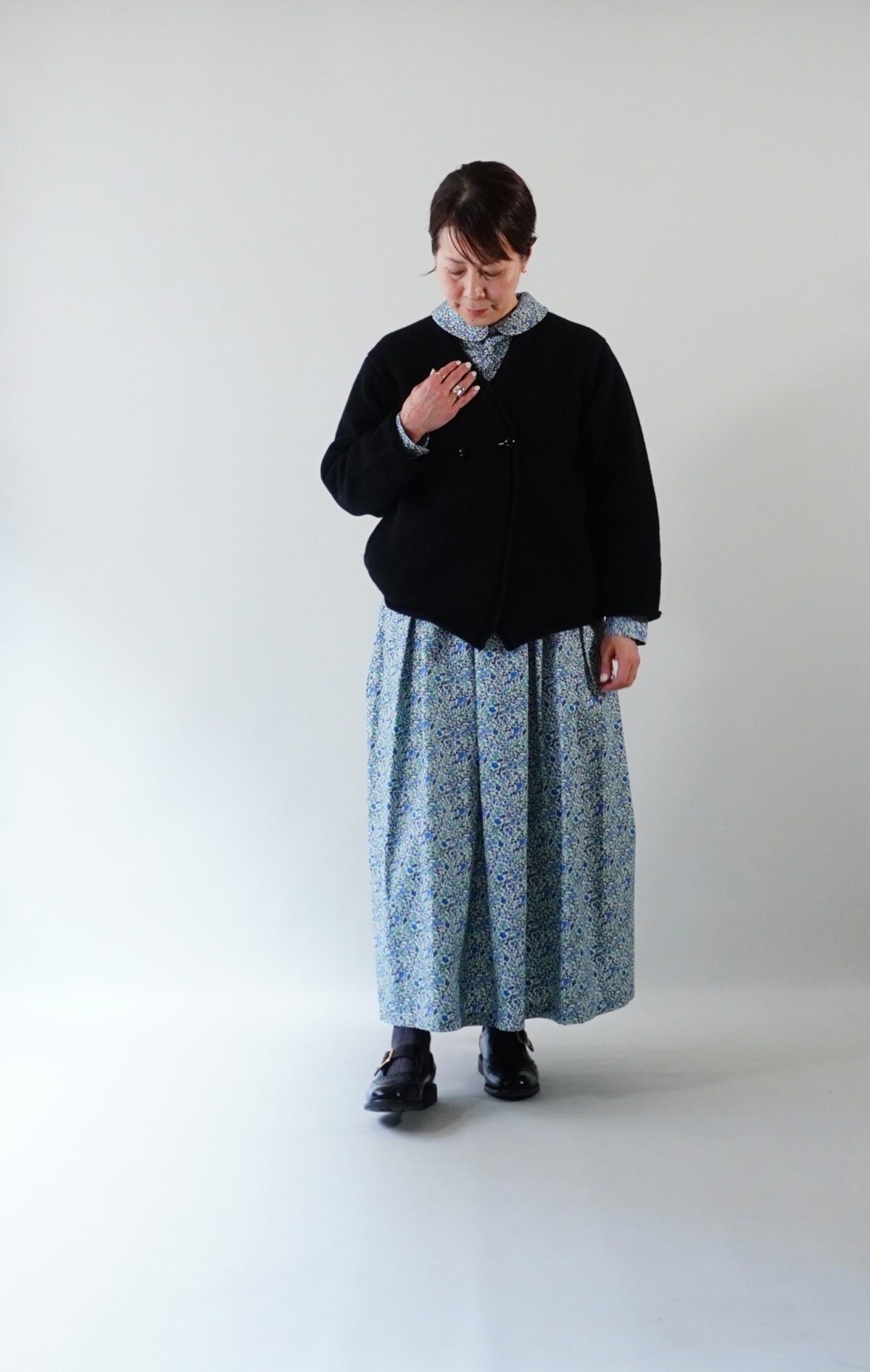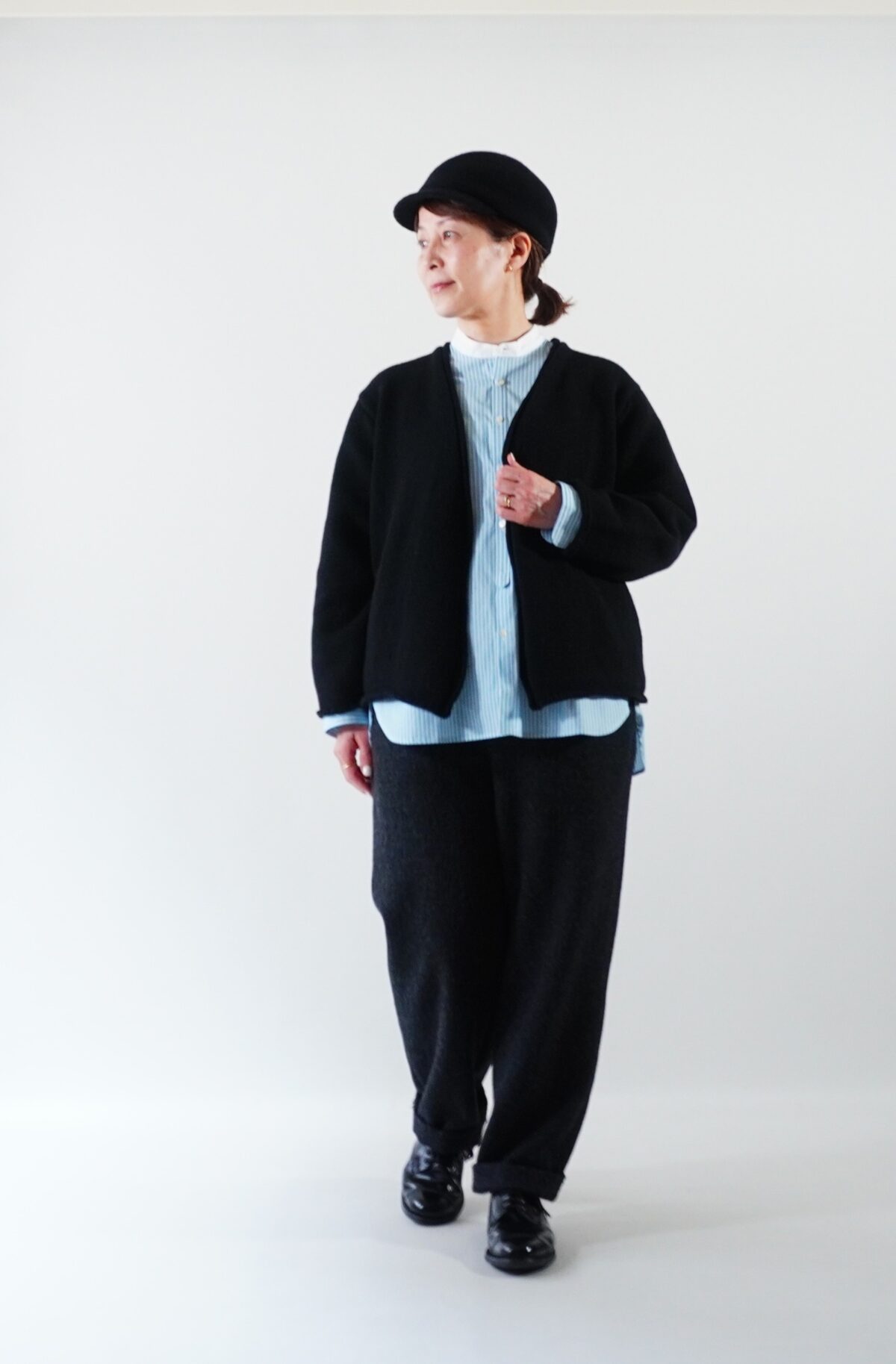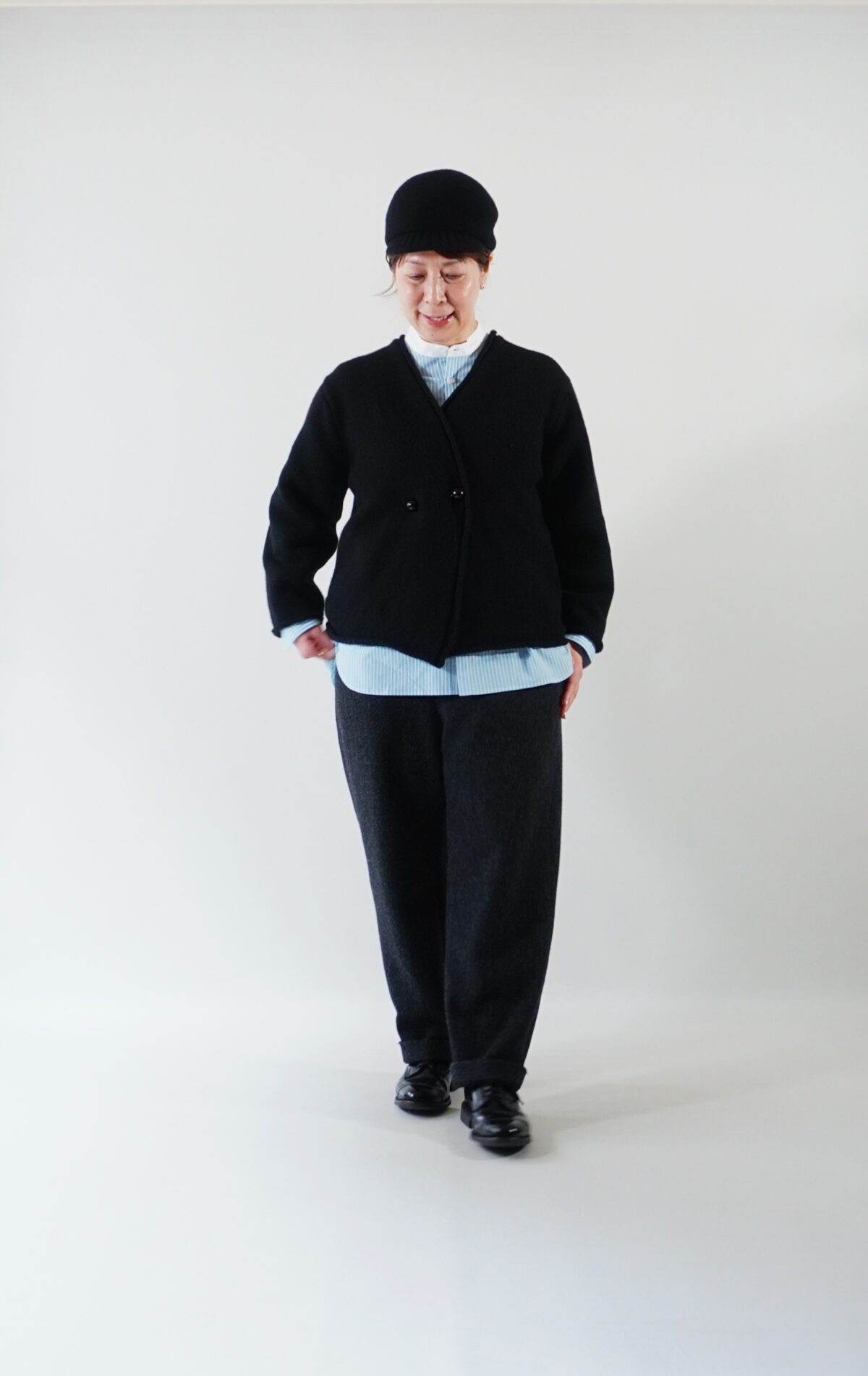 相性が良い【Atelier d’antan】のブラックのニットカーディガンと合わせてみました。