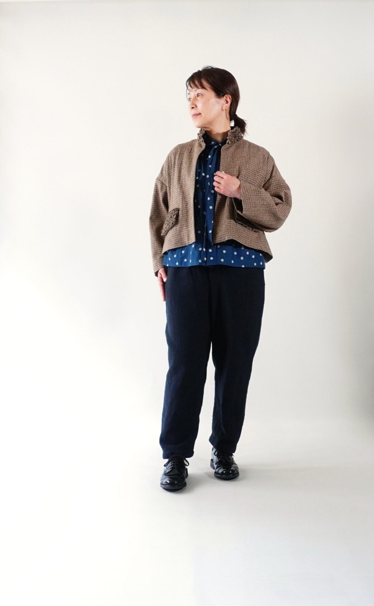 今日の着こなしは一番最初に目を惹いたインディゴブルーのドットのブラウスです。