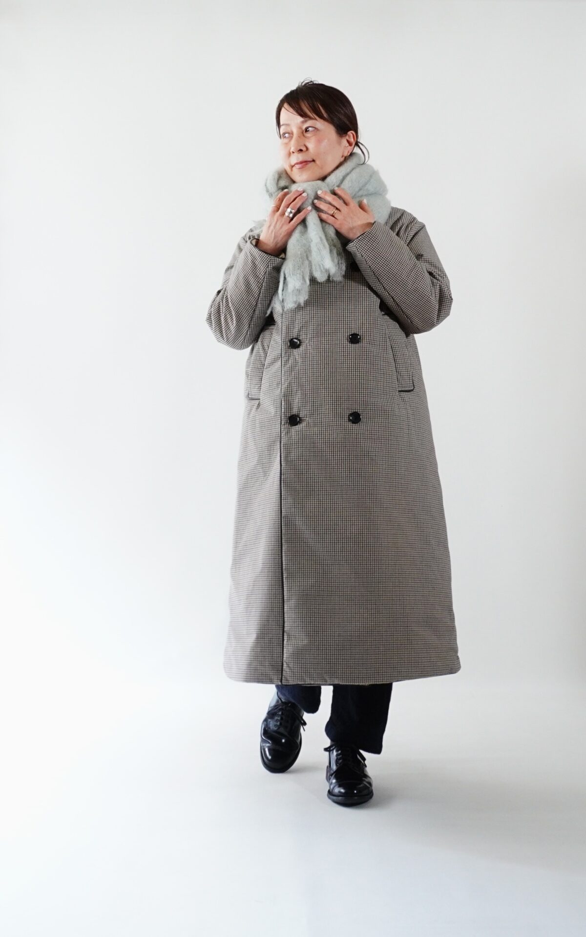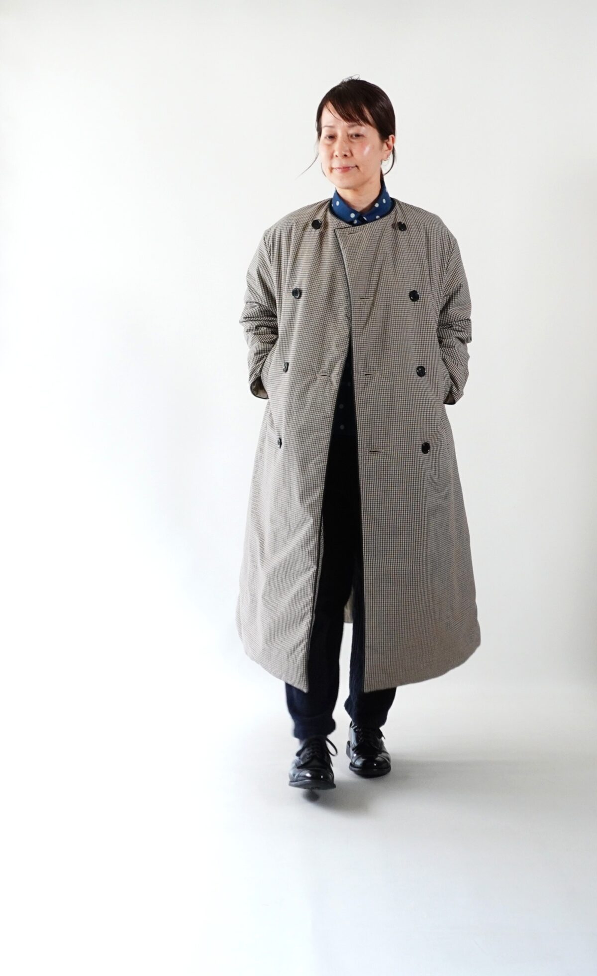 ボール型のキルトピンで前をしっかり止める事でジャケットのような雰囲気に。