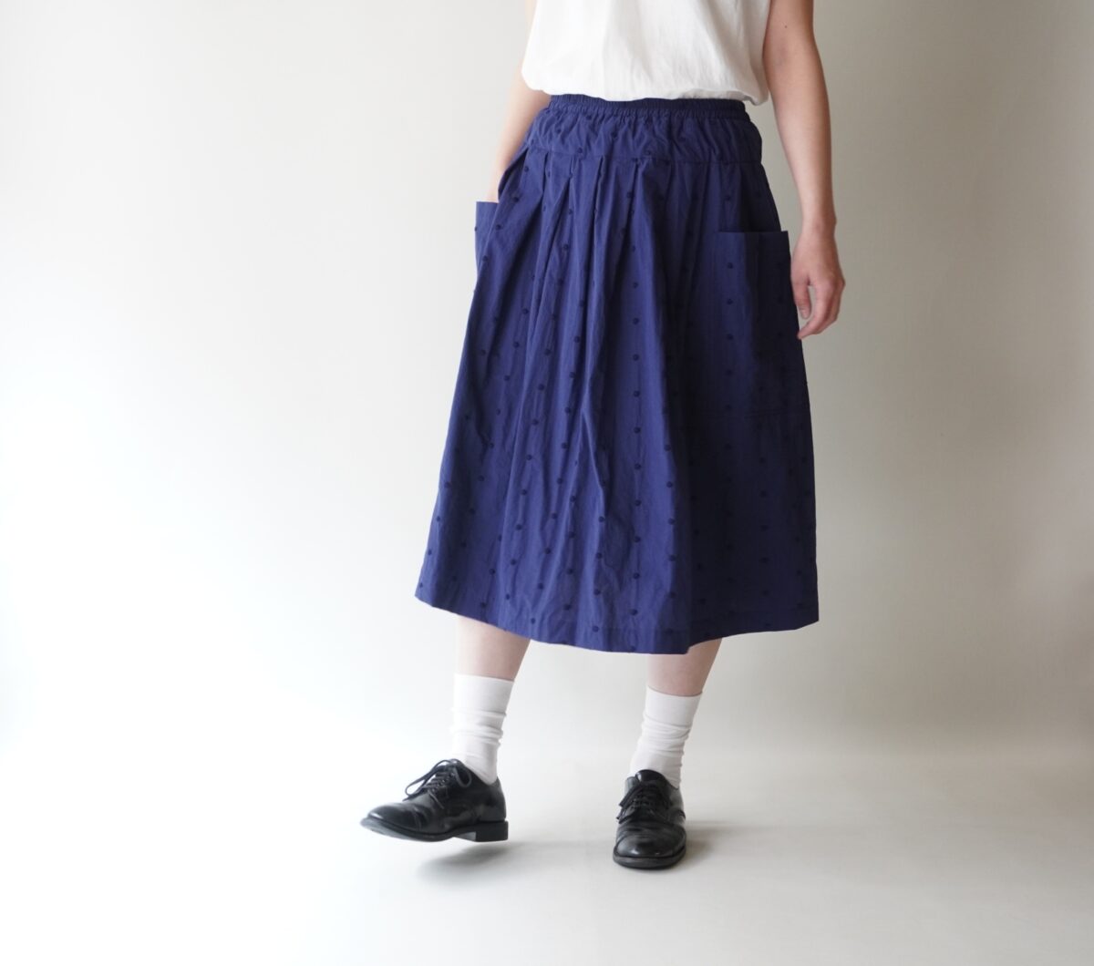 ドット柄が歩くたび、ふわりと美しいスカート。
