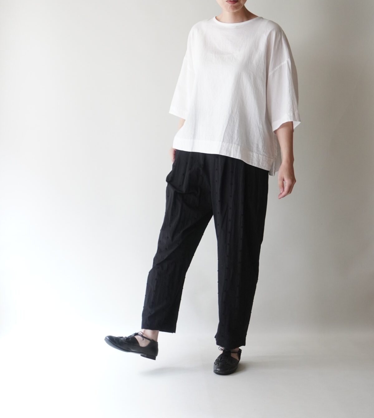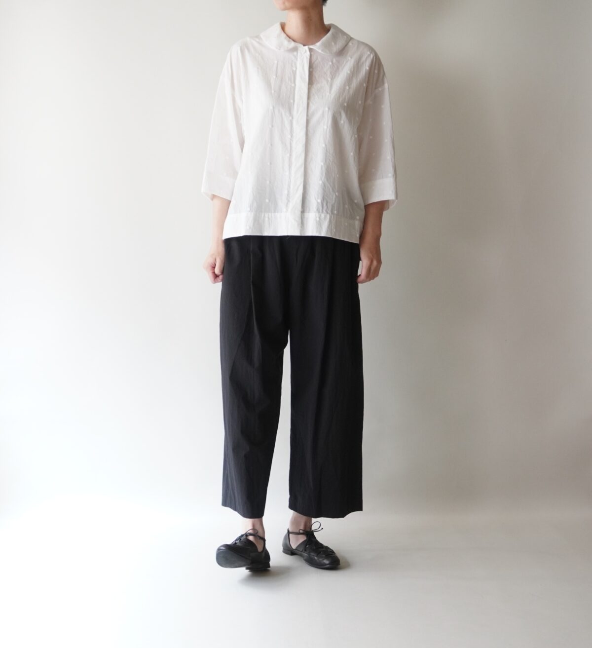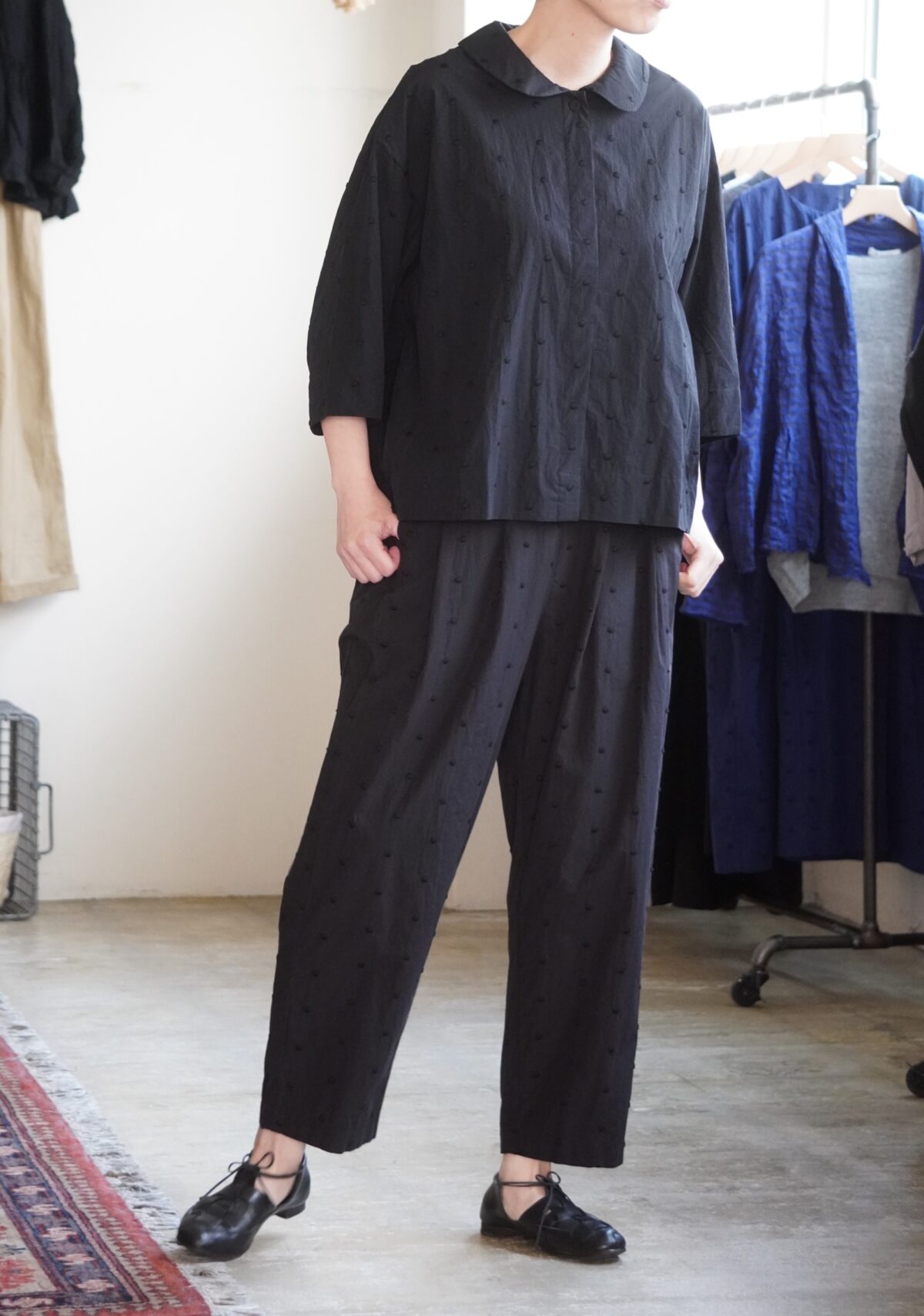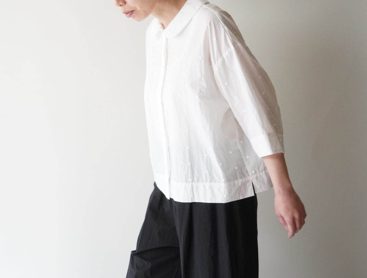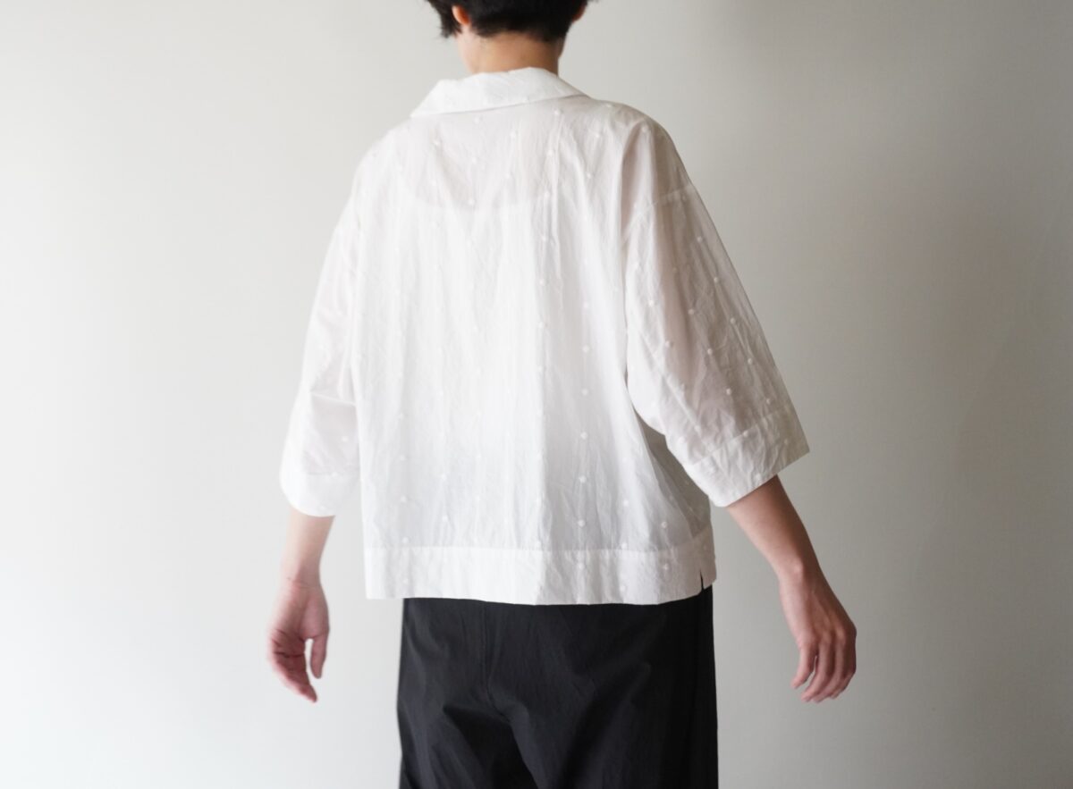 ゆったりとした身幅でふわりと女性らしく、生地と同色のシックなドット刺繍だから、