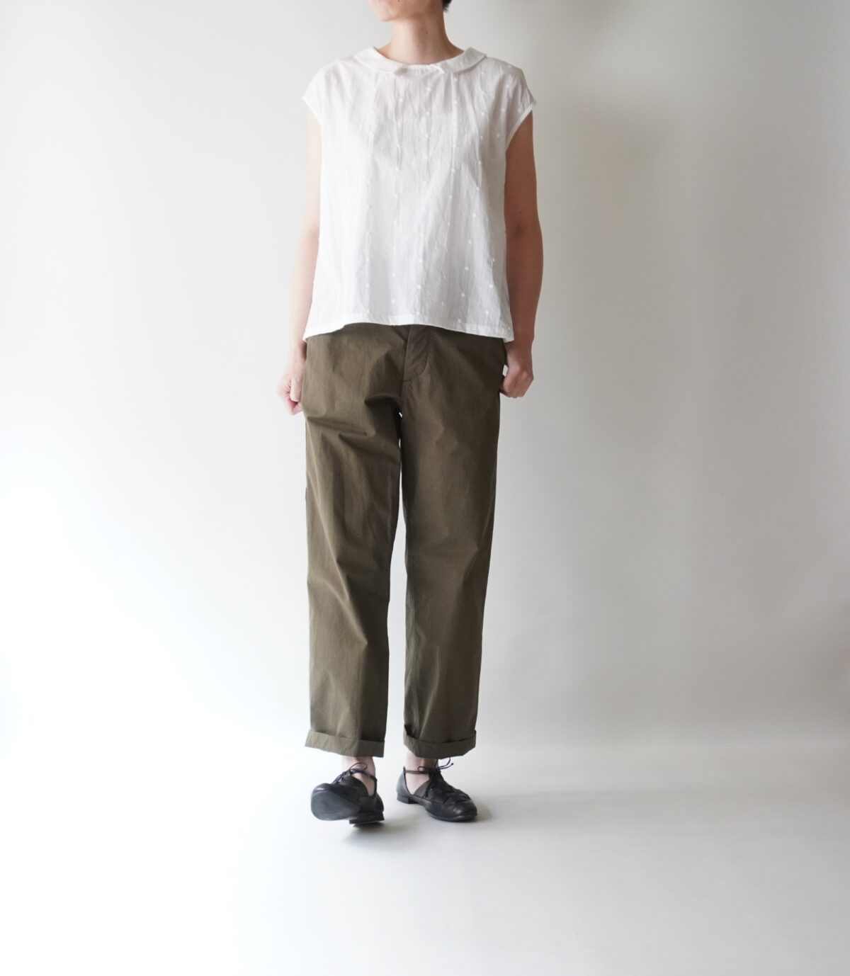 あえてラフに着こなしても、ドット刺繍のおかげでどこか清楚な雰囲気になります。