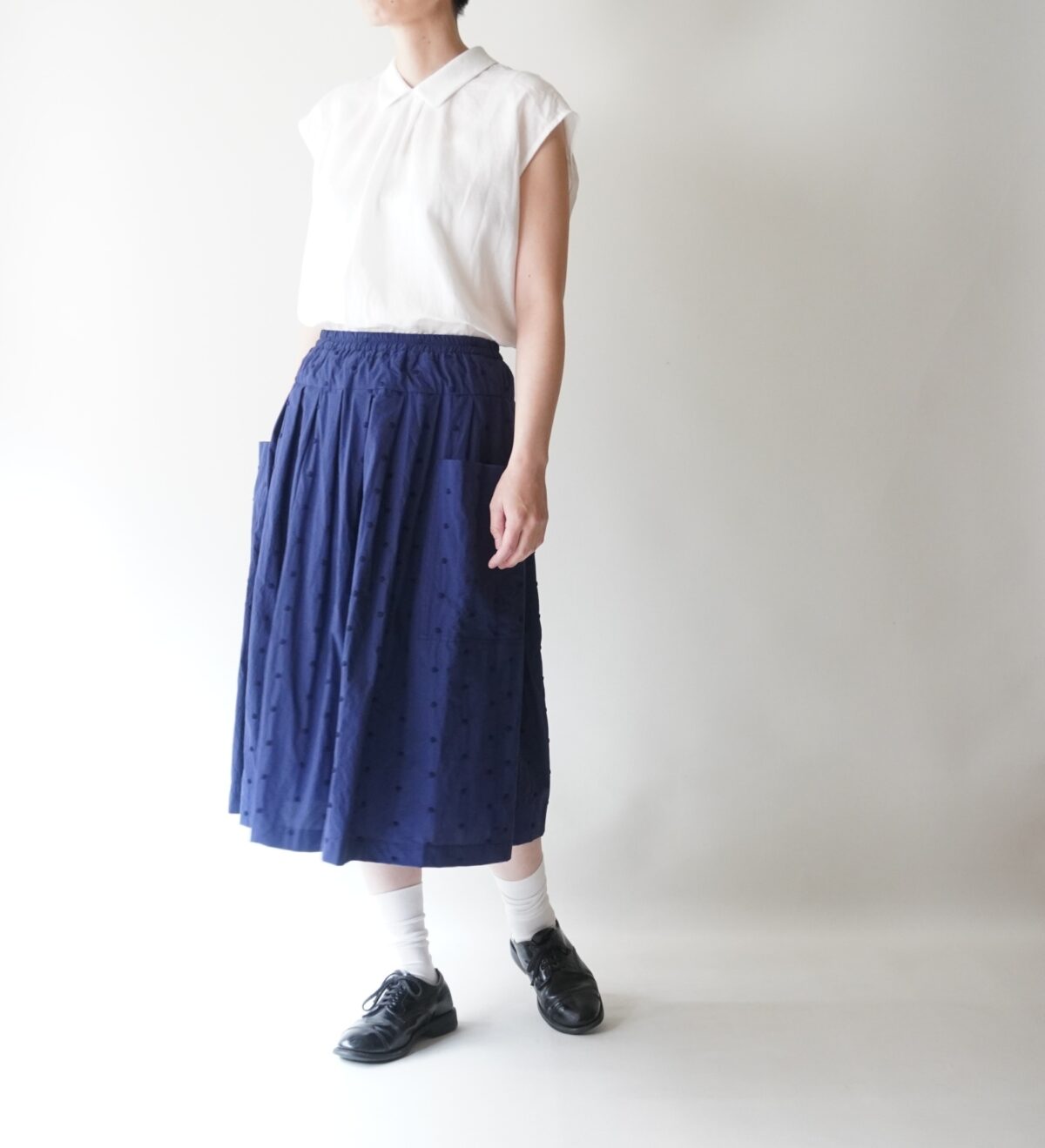 ブラウスと同型のドットスカートやドットパンツとのセットアップもおすすめです。
