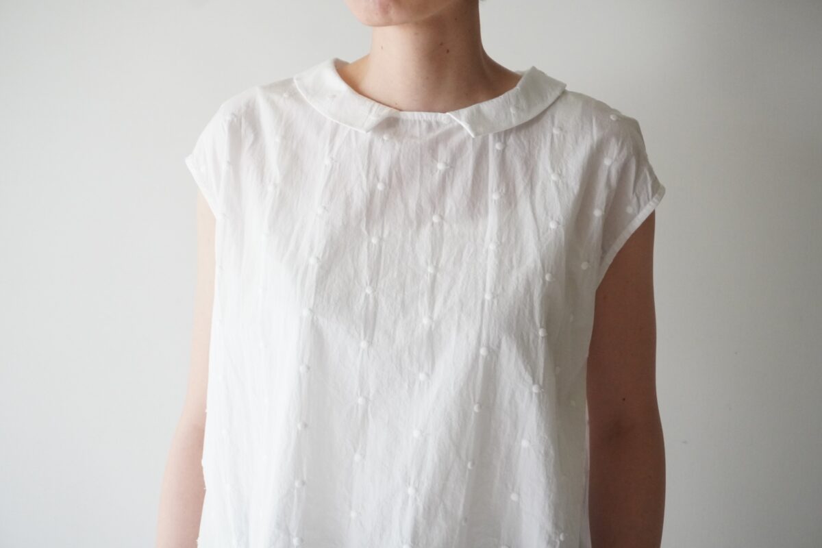 身頃は比翼仕立ですっきりと、肩線から落ちる緩やかなシルエットが丸襟とも相性が良く