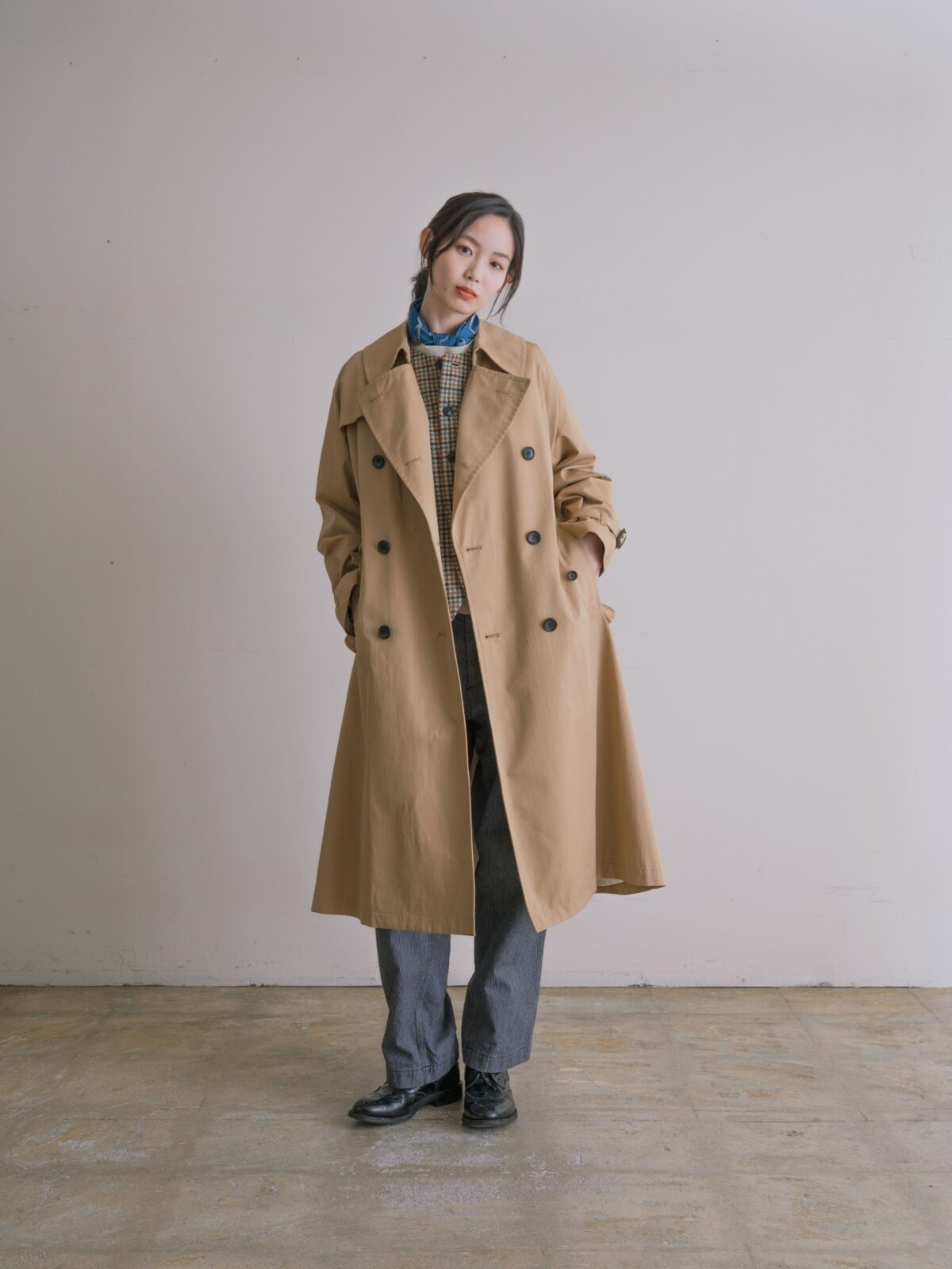 コーディネートに合わせて多様な着こなしを実現できるシェルブールコートは、