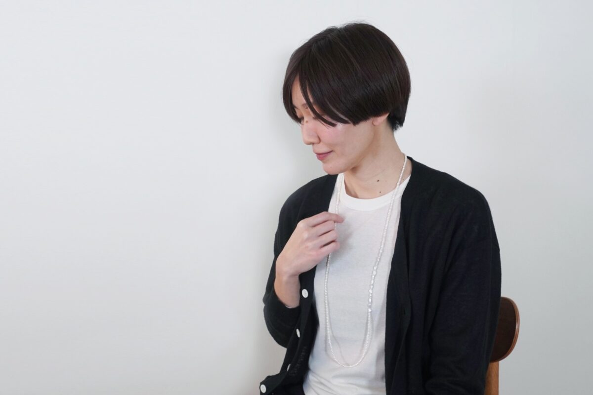 小粒の淡水パールは軽いので長くても重さを気にせずに身につけていただけます。