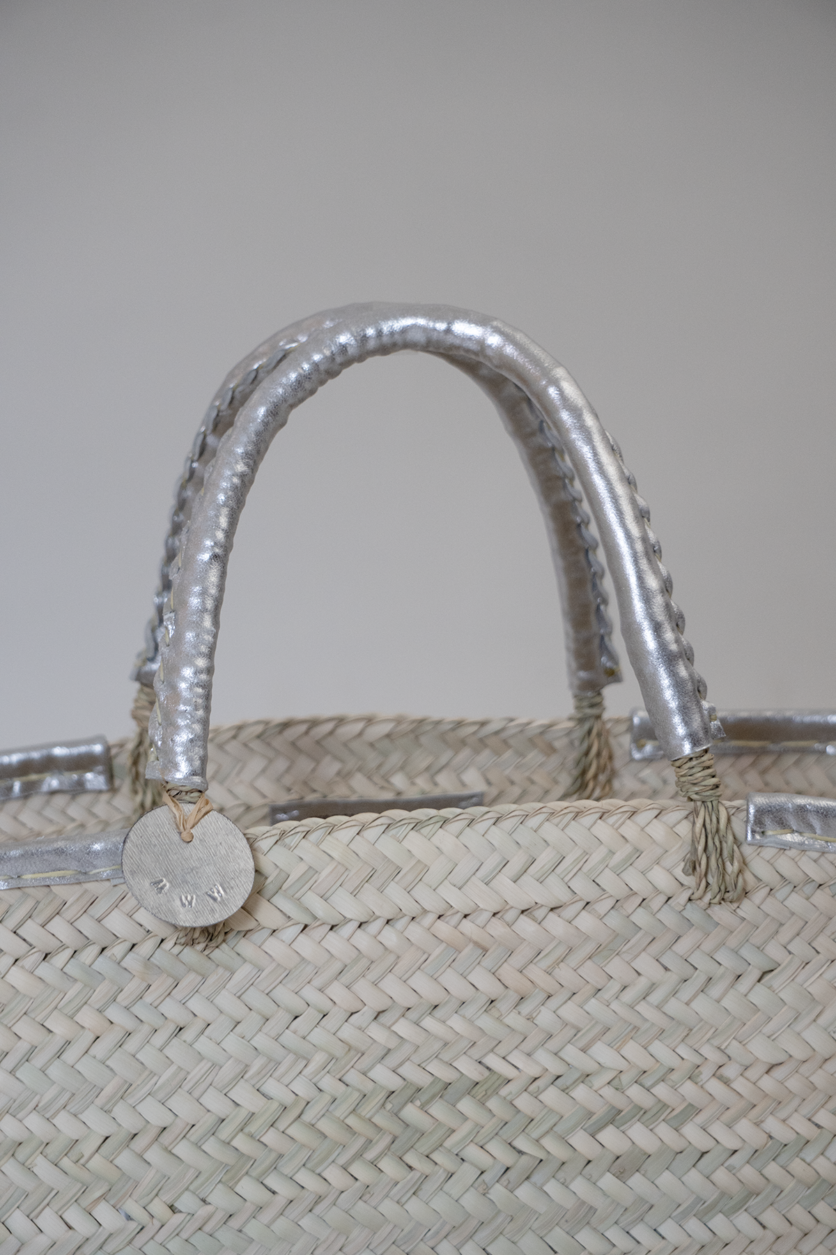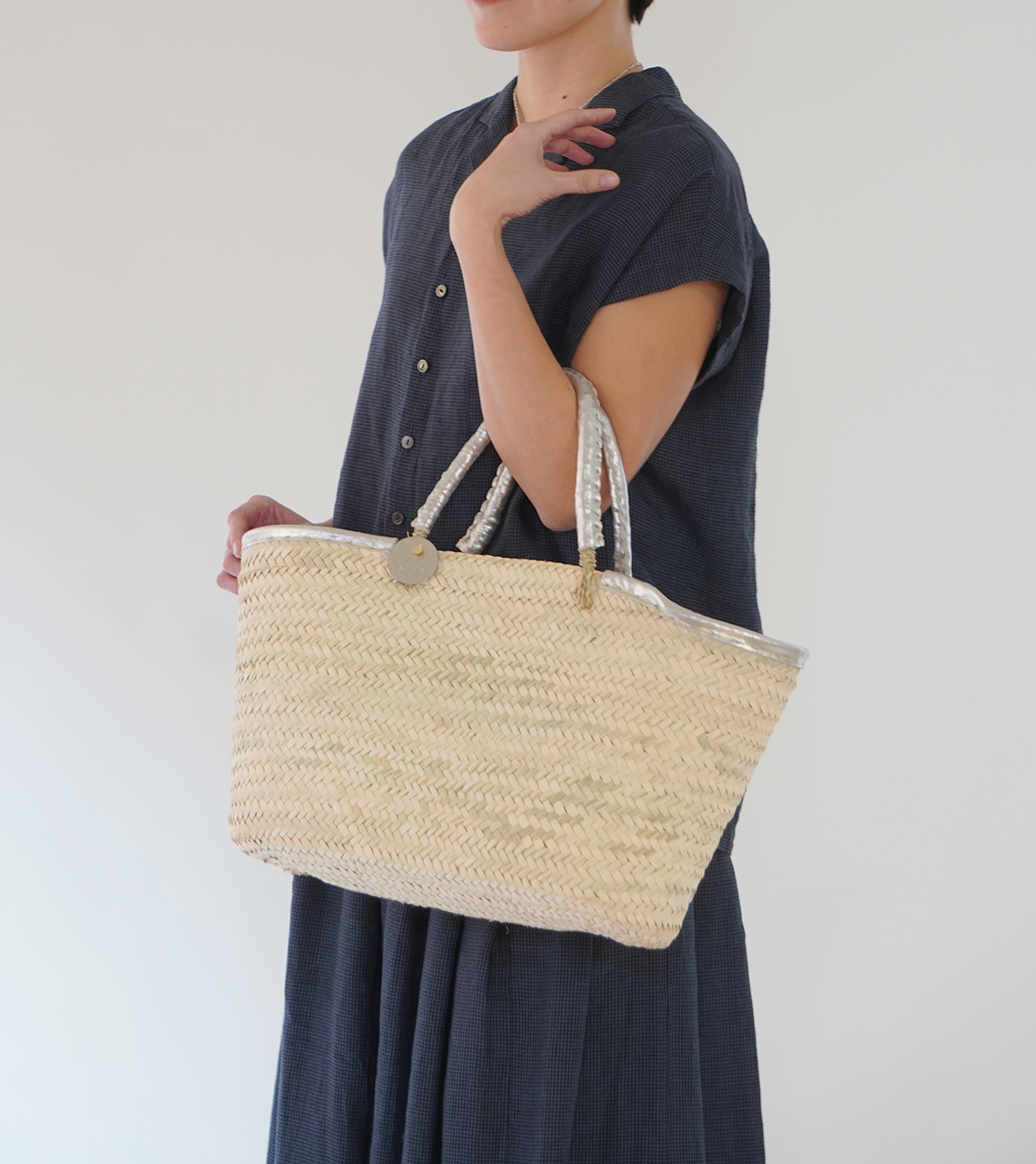 マルシェカゴの縁と持ち手に革を巻きつけたシンプルなデザインのバスケット。