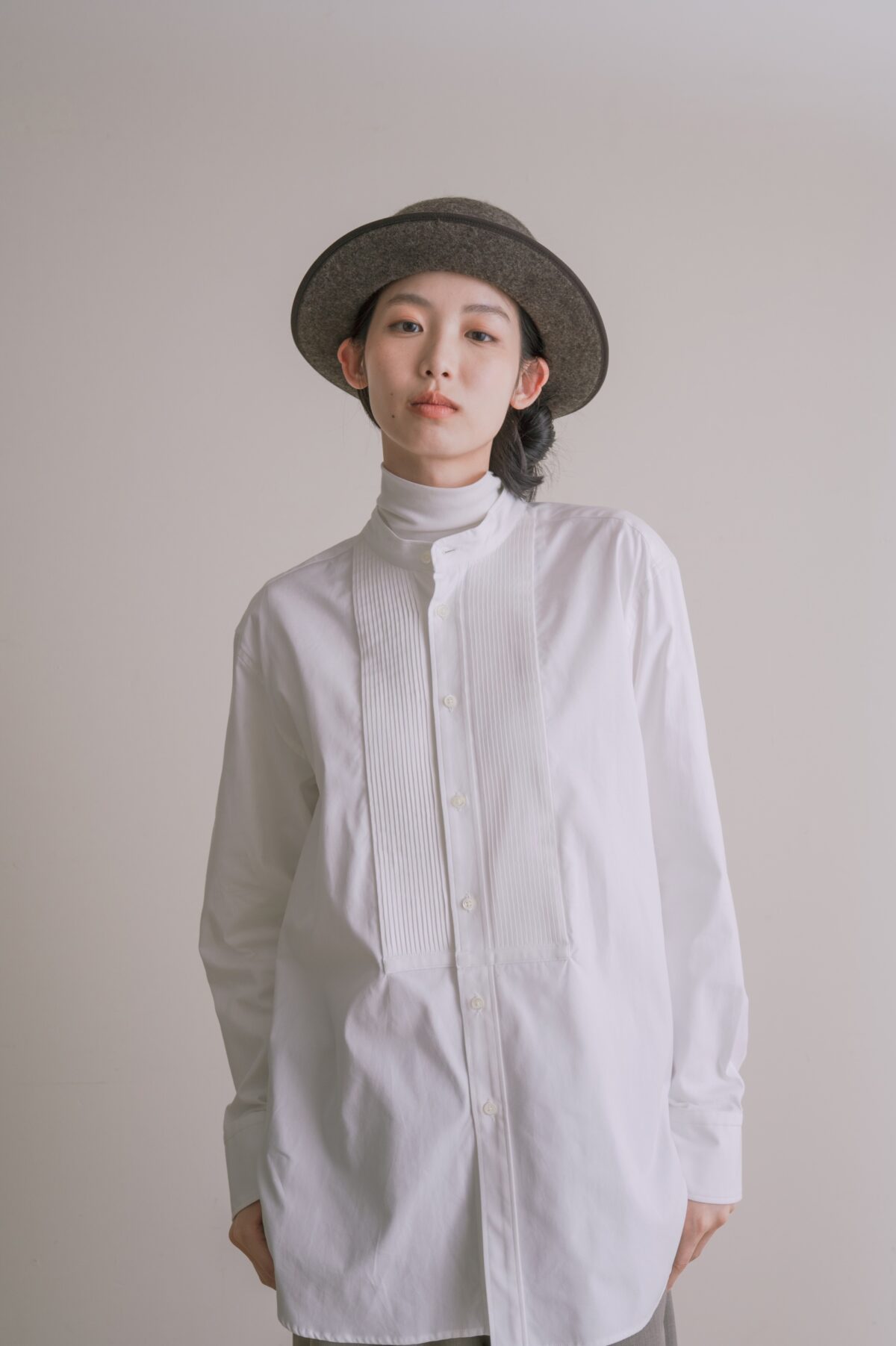 ジャケットやカーディガンを羽織ったときもフロントのピンタックが顔を出し、きれいめな印象に。
