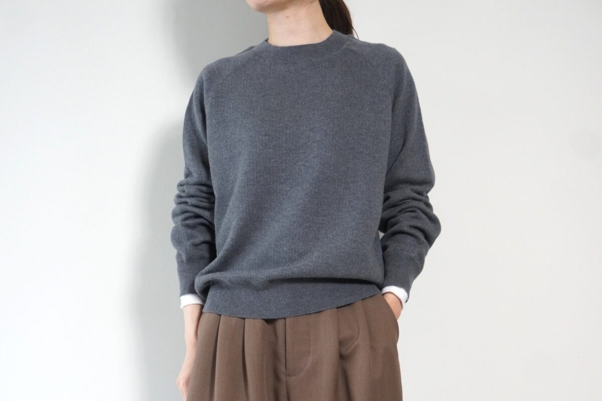詰まりすぎず、開きすぎない襟元ですっきりと着こなせるクルーネックニット。