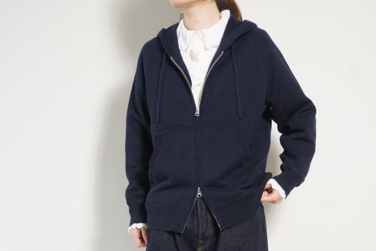 少し大きめのポケットとフードが大人かわいいアイテムです。